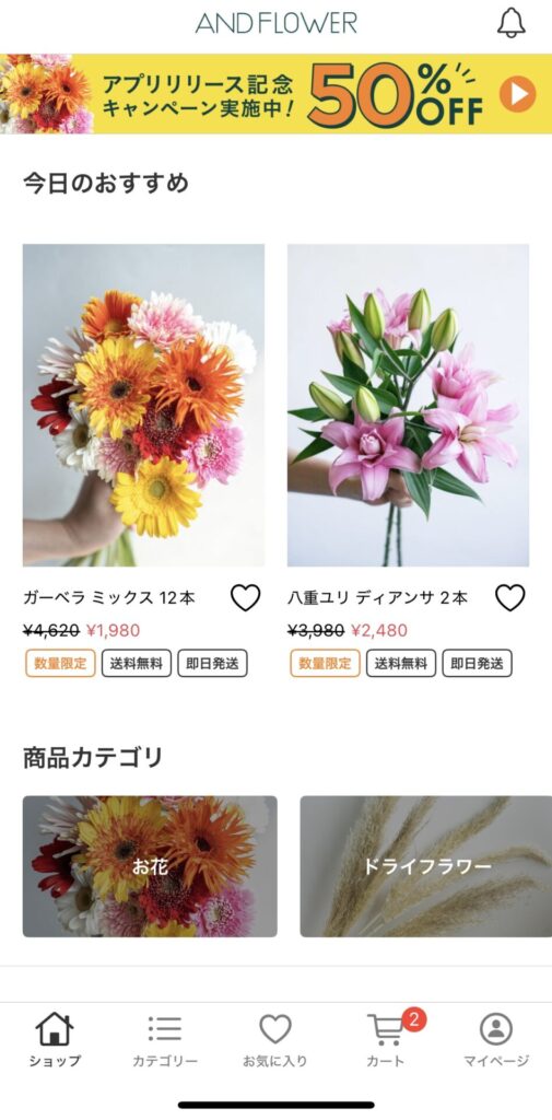 - 『今日のおすすめ』に並んでいるのは2つだけど、『商品方ゴリー』をタップしたり、スクロールすれば『商品一覧』が出てきて、たくさんのお花を見ることができます。
