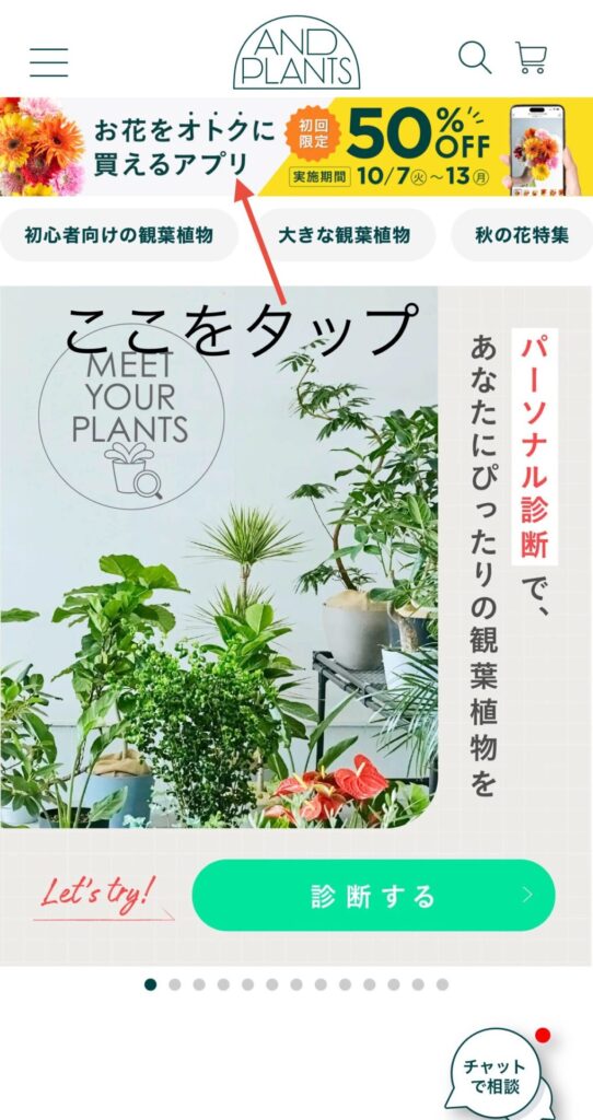 矢印をつけた【お花をオトクに買えるアプリ 50%OFF】の場所をタップ→アプリのダウンロド画面になります。