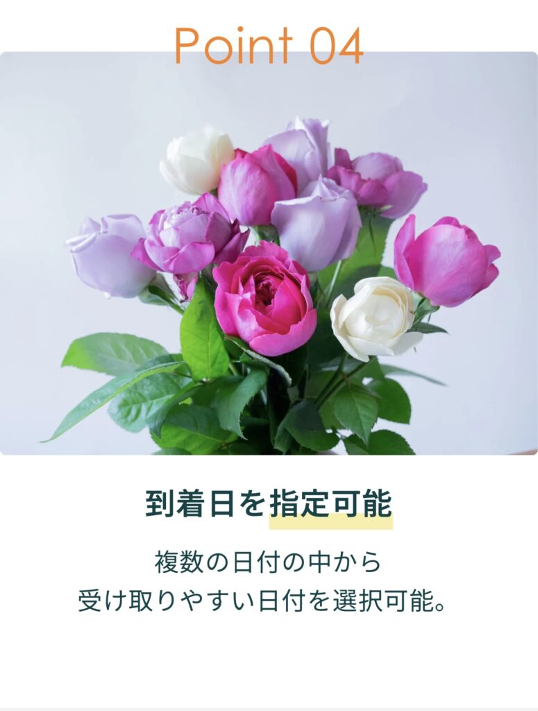 - お花を受け取る日にちを選ぶことができます。(一部のお花は、お届け日が選択できないものもあり)